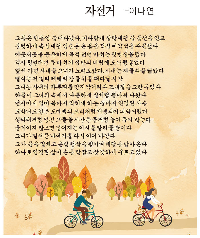 겉으로 드러난 자전거 두 바퀴로 두 사람이 부부되어 살아가는 이야기를 하고 있다. 붕 떠다니던 신혼시절과 레테의 강물 위로 열쇠가 떠다니며 다시 돌아오지 못할 정도로 힘든 권태기가 그려진다. 그러나 자식 생기고 이러저러한 끈들이 연결되어 마치 ‘도마뱀 꼬리처럼 재생되어’ 다시 힘을 보탤 수밖에 없는 과정이 생긴다. 세월 가고 나이 들수록 서로 의지할 수밖에 없는 일이다. 손을 맞잡고 상끗하게 자전거 앞바퀴, 뒷바퀴가 힘을 합쳐 달리는 모습이 그림 같이 펼쳐진다. 은빛 햇살 튕기며 시원하게 바람 가르며 살아가는 것이 더할 수 없는 행복이다.