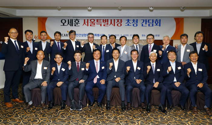 오세훈 시장과 대한건설협회 서울특별시회 참석자들이 간담회를 마치고 기념촬영을 하고 있다.