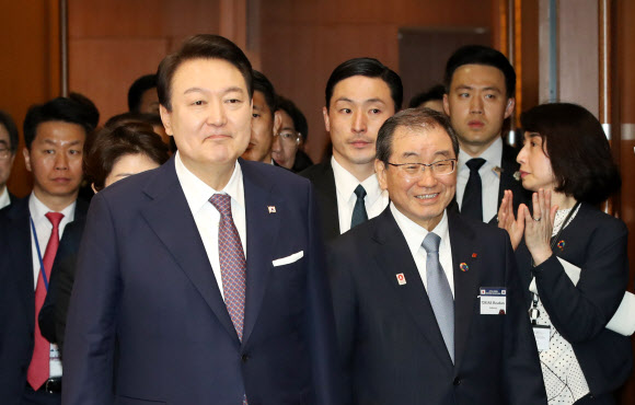 | 1박2일간의 일정으로 일본을 방문한 윤석열 대통령이 17일 도쿄 게이단렌(일본경제단체연합회) 회관에서 열린 한일 비즈니스라운드 테이블에서 도쿠라 마사카즈 게이단렌 회장과 함께 입장하고 있다. /사진: 연합뉴스 |