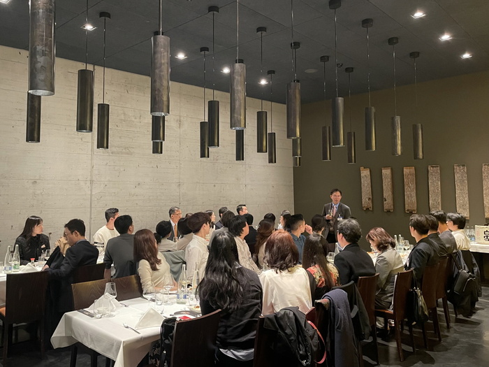 | 지난 18일 스위스 바젤 인근 레스토랑에서 개최된 ‘한국-스위스 제약바이오 네트워크의 밤’에서 이현우 본부장이 국내 제약사 및 스위스 한국계 생명과학자간의 협력을 당부하는 인사말을 하고 있다. / 사진: 한국제약바이오협회 제공 |