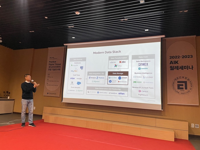 | 김영록 삼인이엔에스 대표가 지난 26일 서울시 서초구 소재 대한건축학회 건축센터에서 열린 ‘AIK 월례세미나’에서 ‘실제 디지털 스레드 - 3D 공간과 데이터 연결 기술과 사례’를 주제로 발표하고 있다. 사진: 김민수 기자 |