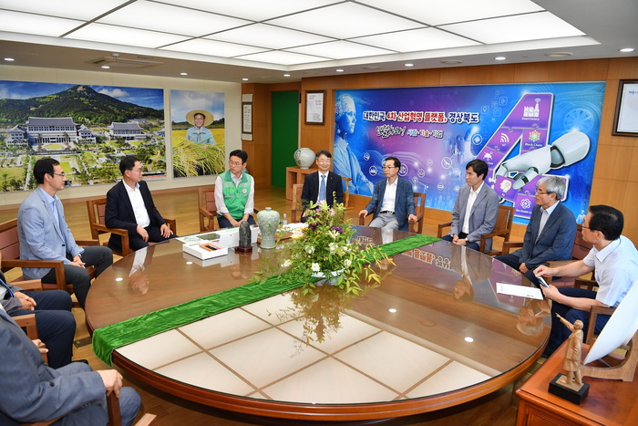 | 이철우 경북도지사(왼쪽 세번째)와 도화엔지니어링 관계자 등이 지난 2일 경북도청에서 진행된 수해복구 성금 전달식에 앞서 대화를 나누고 있다. /사진= 도화엔지니어링 |