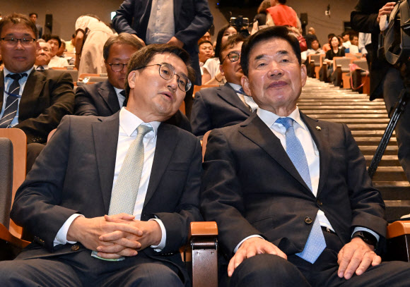 | 김진표 국회의장(오른쪽)과 김동연 경기도지사가 4일 경기도청에서 열린 '국민공감 개헌 시민공청회'에서 대화를 나누고 있다./사진:연합뉴스 |