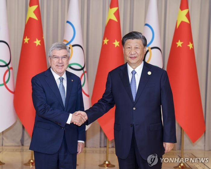| 토마스 바흐 IOC 위원장(왼쪽)이 시진핑 중국 국가주석과 악수하는 모습. /사진:연합뉴스 |