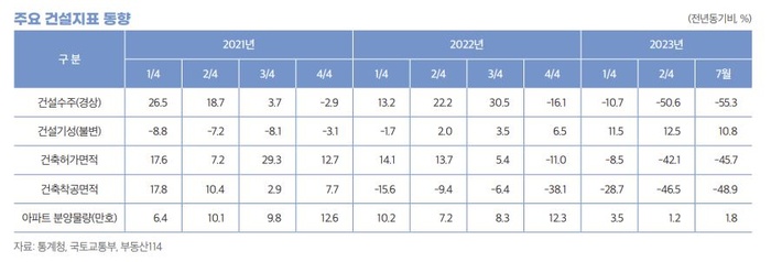 2023년 7월 건설지표에서 ‘건설기성’은 10.8% 증가했지만 건설수주, 건축허가 및 착공면적 등은 50% 가까이 감소한 것으로 나타났다. 건설수주는 1분기 11.1%, 2분기 31.5% 줄어든 데 이어 7월에도 55.3%나 쪼그라들었다.