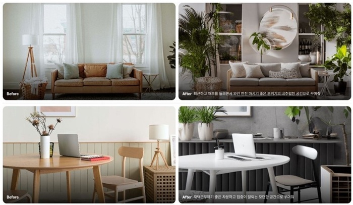 | 아키스케치 AI 인테리어로 생성한 인테리어 디자인 전과 후. 사진: 아키드로우 |