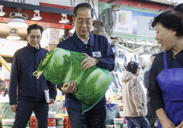 [대한경제=김광호 기자] 한덕수 국무총리가 24일 서울 마포구 마포 농수산물 시장을 찾아 배추 등 물가를 점검하고 시장 상인의 의견을 청취했다.