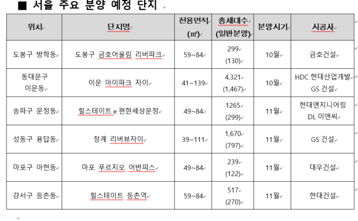 26일 부동산 114랩스에 따르면 올해 연말까지 서울에서 분양 대기 중인 단지는 △도봉구 금호어울림 리버파크 △이문 아이파크 자이 △청계 리버뷰자이 △ 힐스테이트e편한세상문정 △마포 푸르지오 어반피스 △힐스테이트 등촌역 등이다.