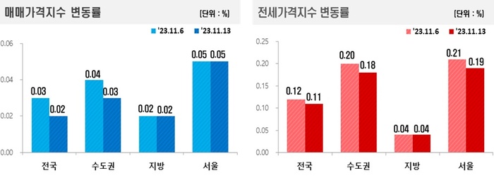 16일 한국부동산원이 발표한 ‘11월 2주(13일 기준) 전국 주간 아파트 가격 동향’에 따르면 전국의 아파트 매매 가격은 전주 대비 0.02% 상승했다. 18주 연속 상승세를 지속하고 있지만 상승폭은 둔화되는 양상이다.