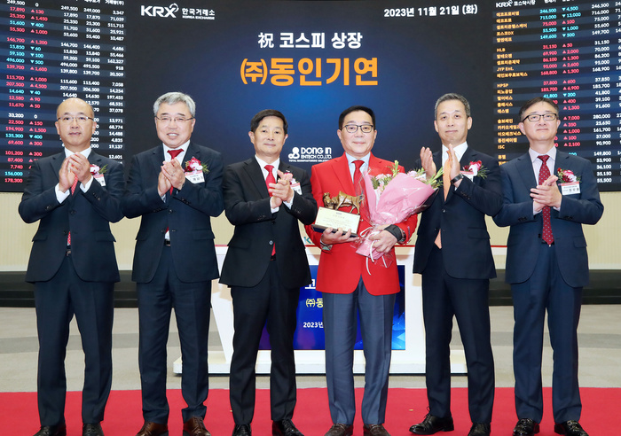 | 한국거래소 유가증권시장본부는 21일 서울사옥 홍보관에서 동인기연의 유가증권시장 상장기념식을 개최했다. 왼쪽부터 정지헌 한국거래소 유가증권시장본부장보, 채남기 한국IR협의회 회장, 양태영 한국거래소 유가증권시장본부장, 정인수 동인기연 대표이사, 윤병운 NH투자증권 부사장, 정우용 상장회사협의회 부회장 |