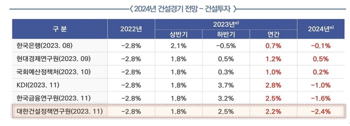 하지만 2024년 건설경기는 마이너스 성장이 불가피하고 금융시장 불안, 생산요소 수급 차질, 공사비 상승 등 부정적 요인이 부각될 경우 침체는 더욱 심화될 것으로 예측했다.