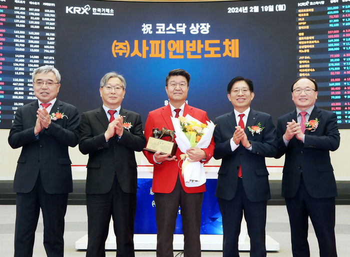 | 19일 여의도 한국거래소 서울사옥에서 (왼쪽부터) 채남기 한국IR협의회장, 홍순욱 거래소 코스닥시장본부장, 이명희 사피엔반도체 대표이사, 강성묵 하나증권 대표이사, 강왕락 코스닥협회 부회장이 사피엔반도체 코스닥시장 상장 기념촬영을 하고 있다. /사진:한국거래소 |