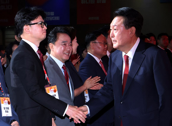 [대한경제=강성규 기자] 윤석열 대통령과 한동훈 국민의힘 대표 등 전당대회 출마자들이 24일 만찬을 갖는다.
