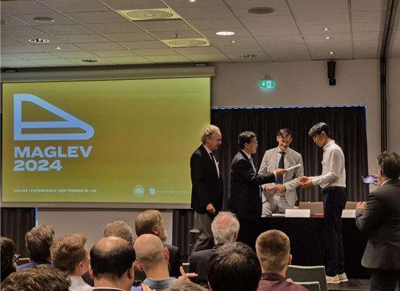 | 지난달 18~22일 스웨덴 말뫼에서 열린 자기부상(Maglev2024) 국제학술대회에서 김정석 철도연 수석연구원이 하이퍼튜브 차체 경량화 기술연구로 최우수 논문상을 수상하고 있다. /사진: 한국철도기술연구원 |
