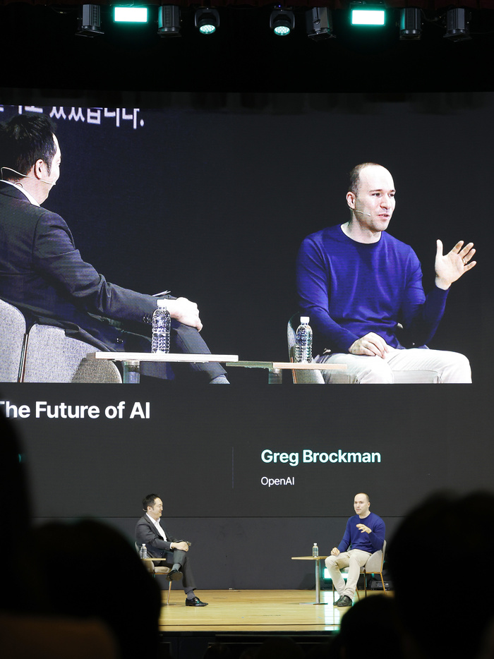 그레그 브로크만(Greg Brockman) 오픈 AI 회장 겸 사장이 4일 서울 강남구 코엑스에서 열린 'SK AI 서밋 2024(SK AI Summit 2024)'에서 이준표 SBVA 대표와 'AI의 미래'를 주제로 대담하고 있다.