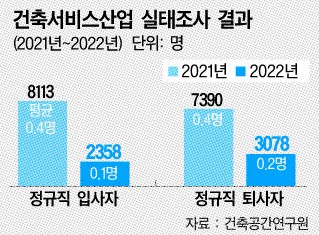 조사에서는 2021년과 2022년 ‘건축 설계 및 관련 서비스업’ 입사자가 각각 8113명, 2358명인 데 반해 퇴사자는 7390명, 3078명으로 파악돼 인력 이탈이 가속화하는 모습이다.