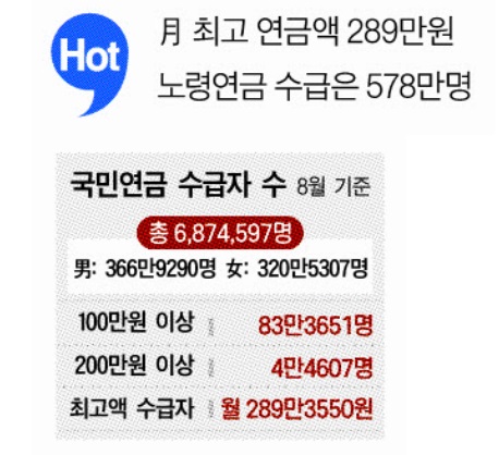 국민연금 최고액 수급자의 연금액은 월 289만3550원이다. 평균 수급액은 노령연금 월 66만3382원, 장애연금 월 52만5192원, 유족연금 월 36만333원이다.