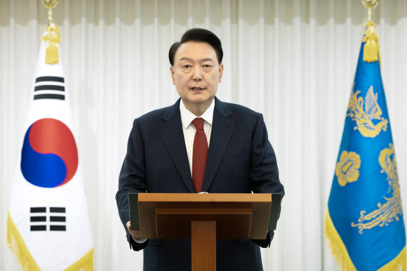 | 윤석열 대통령이 14일 본인의 탄핵소추안이 국회에서 가결된 뒤 한남동 관저에서 대국민담화를 하고 있다. [대통령실 제공] |