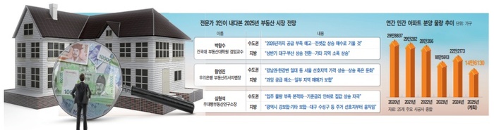 박합수 건국대 부동산대학원 겸임교수는 “공급 부족, 즉 입주 물량이 감소하면서 가격 상승세가 계속될 수 있다”며 “공급 부족이 투자자의 매수 심리를 촉발하고 관심도 서울 위주에서 경기 지역으로 확대시켜, 2025년 수도권 아파트 가격은 상승할 것으로 전망된다”고 언급했다.