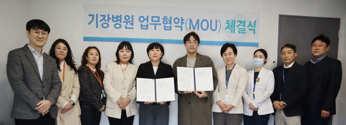 | 기장지역자활센터 및 기장병원 관계자들이 협약을 체결하고 기념촬영을 하고 있다. / 사진 : 부산 기장군 제공 |