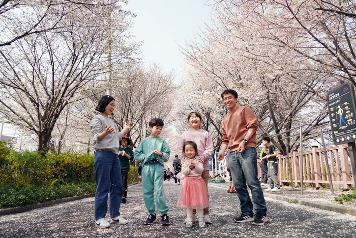 | 벚꽃 핀 서울 동대문구 장안벚꽃길에서 여유로운 한 때를 보내는 가족들. / 사진 : 동대문구 제공 |