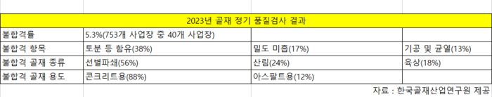 2024년 검사 결과가 아직 공개되지 않은 가운데 2023년 결과를 살펴보면 부적합 골재의 유통ㆍ사용을 미루어 짐작할 수 있다. 당시 불합격률은 5.3%(753개 사업장 중 40곳)였다. 불합격 항목은 △미립분 과다(토분ㆍ석분) 38% △기공ㆍ균열 과다(밀도) 17% 등의 순이었고, 종류별로는 대규모 개발 사업지에서 채취한 선별ㆍ파쇄골재가 56%로 가장 많았다.