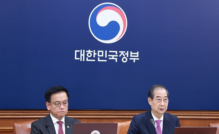 | 한덕수 대통령 권한대행 국무총리가 8일 정부서울청사에서 열린 국무회의에서 발언하고 있다. 한 권한대행 왼쪽은 최상목 경제부총리 겸 기획재정부 장관./사진:연합뉴스 |