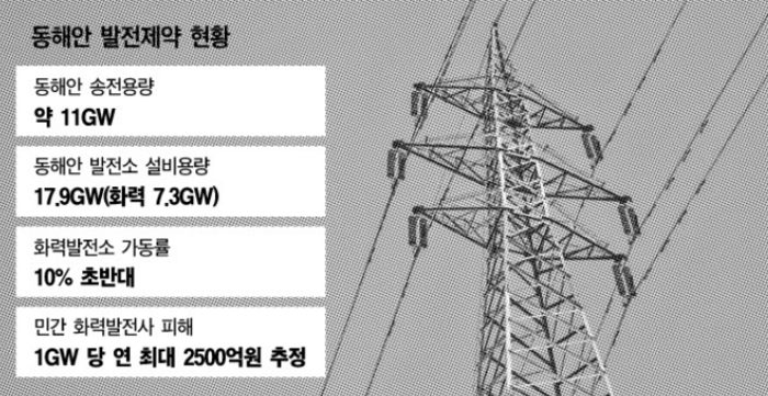 동해안 지역의 송전선로 용량은 총 22GW다. 송전망 신뢰도 운영 기준에 따라, 실제 전력을 수송하는 선로용량은 절반에 해당하는 약 11GW 정도다. 반면, 동해안 지역에는 원전(8.7GW), 양수(1.8GW), 화력(7.4GW) 등 총 17.9GW의 발전설비가 설치돼 있다. 단순 계산하면 6∼7GW의 송전제약이 발생할 수밖에 없는 구조다. 송전망 포화에 따른 발전제약은 삼척그린파워ㆍ북평화력ㆍ강릉안인화력ㆍ삼척블루파워 등 8기의 화력발전기에 집중되고 있다.