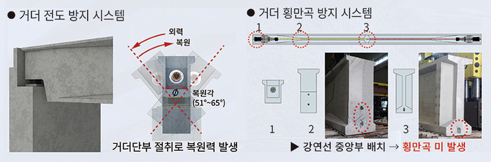| 오뚜기 거더는 PSC 거더 단부 절취로 무게중심을 하향시켜 전도 사고 방지 효과를 극대화했다. 강연선의 중앙부 배치로 횡만곡과 횡좌굴 방지를 도모했다. |