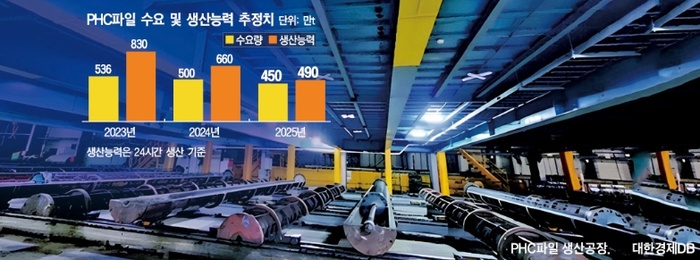 이병락 한국PHC파일협회 회장은 “파일 생산에는 한 조(주간/야간)당 40여명의 인원이 필요한데, 업체들이 인원을 감축해 이제는 생산량을 늘리고 싶어도 그러지 못하는 상황”이라고 말했다. 국내 전체 파일생산능력은 2023년 연 830만t수준에서 올해 490만t까지 떨어진 것으로 추정된다. 24시간 생산 기준으로, 대부분의 업체가 주간 생산만 하는 점을 고려하면 실제 생산능력은 더 떨어진다.