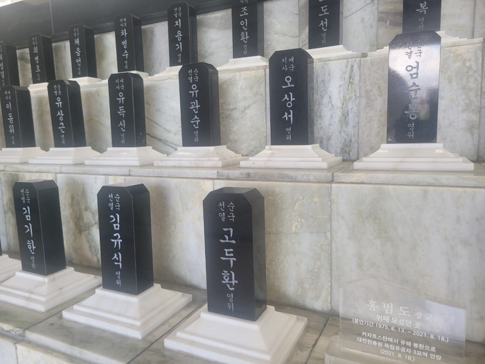 타국에 모셔졌다가 고국에 송환된 독립운동가로는 홍범도 장군이 대표적이다. 공군 전투기의 호위를 받으며 그를 모신 항공기가 고국 영공에 개선장군처럼 진입할 때 ‘이제야 독립운동가들에게 제대로 대접을 하는구나’라는 생각도 했다. 국립대전현충원에 모셔졌고 대전 현충원역에서 현충원까지 이어지는 길은 홍범도장군길로 이름 붙여졌다.