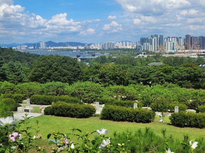 현충원 정문에서부터 따지면 제일 많이 걸어야 하는 맨 뒷쪽이다. 하지만, 현충원 전체로 보면 제일 높은 곳이다. 독립유공자들이 잠들어있는 묘역에서 저멀리 한강과 서울 풍경을 내려다본다. 선열들도 이런 조국의 모습을 보고 계실까.