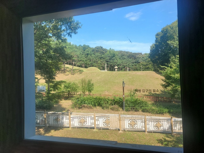 | 백범김구기념관 추모공간 창밖으로 보이는 김구 선생 묘역 |