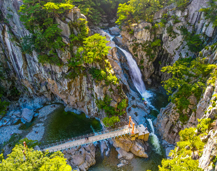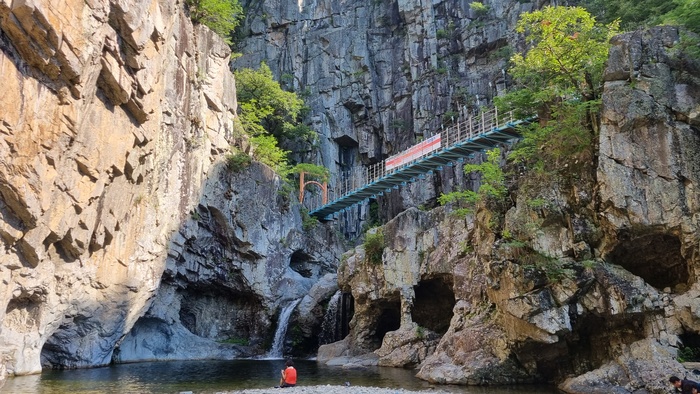 보현암 쪽 계곡길로 내려간다. 거슬러 500m쯤 오르면 관음폭포와 연산폭포다. 관음폭포에선 두 눈처럼 생긴 굴 옆으로 물 두 줄기가 사뿐하게 내려앉는다. 폭포 위로는 연산폭포로 이어지는 연산구름다리가 놓여 있는데 자연미와 인공미가 공존하며 나름 잘 어울린다.