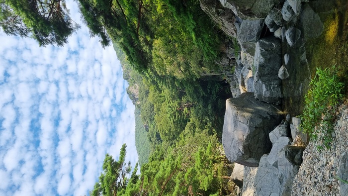 전망대가 꽤 높은지 경사가 급하다. 전망대에 못 미쳐 계곡 건너편으로 괜찮은 풍경이 보인다. 걸음을 멈추고 좋은 각도를 찾아 사진을 몇 장 찍어 본다.