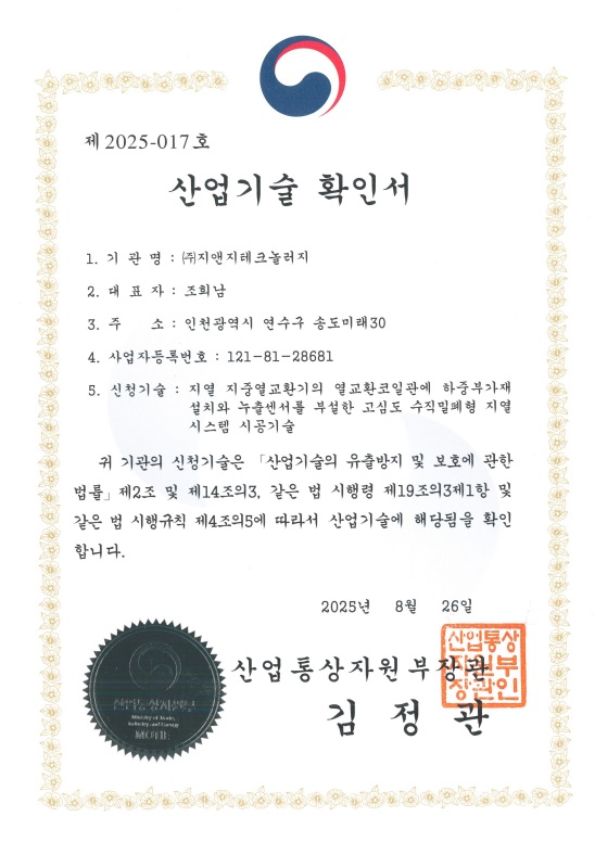 지열 신재생에너지 전문기업인 ㈜지앤지테크놀러지(대표 이사 조희남)가 고심도 수직밀폐형 지중열교환기–‘딥코일300’ 기술과 장치에 대해 산업통상자원부 장관으로부터 ‘산업기술확인서’를 발부받았다.