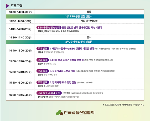 이번 포럼에서는 협회 식품산업 공급망 ESG 공동사업 참여 원청사 9곳(남양유업ㆍ농심ㆍ롯데웰푸드ㆍ빙그레ㆍ샘표식품ㆍ오뚜기ㆍ오리온ㆍ풀무원ㆍCJ제일제당)과 협력사 대표들이 참석해 협력 의지를 다진다. 또 ESG 경영 사례를 공유하고 토론도 열 예정이다.