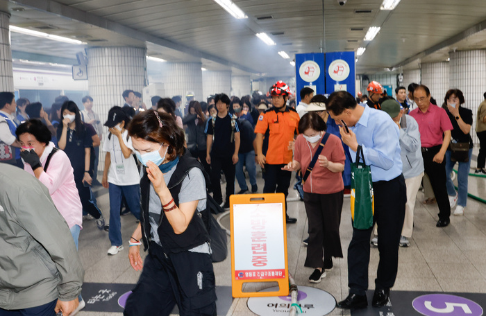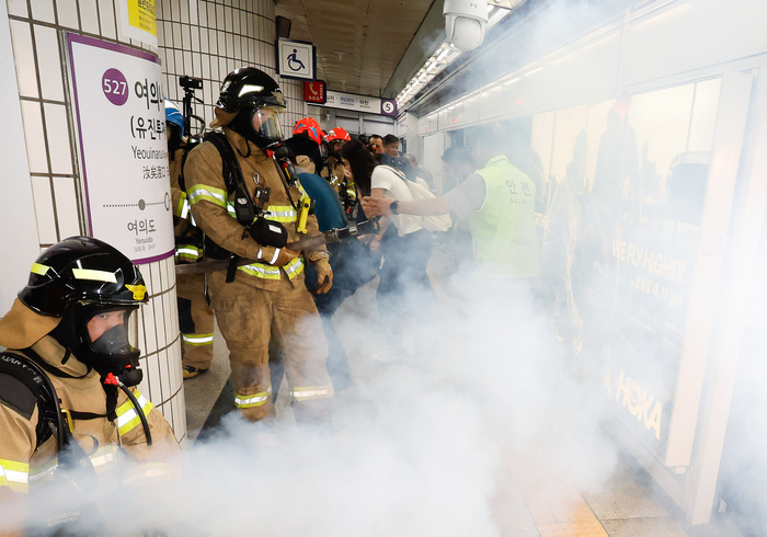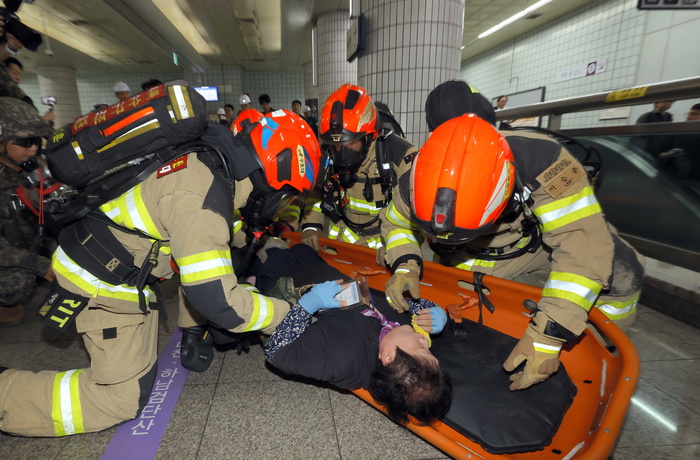 22일 오후 서울 영등포구 여의나루역(5호선)에서 실시된 ‘서울시 재난대응 안전한국훈련’에서 소방대원들이 부상자를 구조하고 있다. 이번 훈련은 지하철 화재 , 사고와 흉기 난동 등이 복합적으로 발생하는 상황을 가정해 진행됐다.