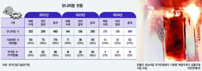 28일 한국건설기술연구원(건설연)에 따르면 지난해 ‘건축 화재안전 모니터링(건축자재분야)’으로 총 346건의 건설현장 단열재(외단열재, 복합자재 심재) 준불연 성능 모니터링이 진행됐으며 이중 성능 미달 등 부적합 건수는 18건(5%)에 그쳤다. 2022년 부적합률 19%(460건 중 86건)과 비교해 2년 만에 14%포인트 개선됐다.