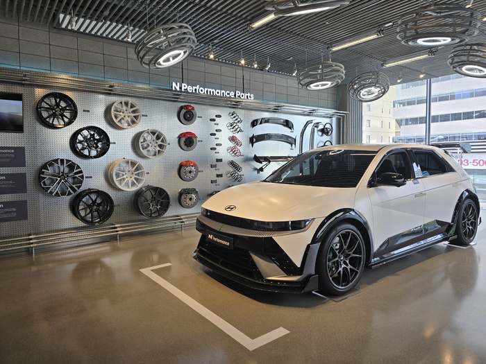 | 현대 모터스튜디오 서울 3층에 전시된 아이오닉 5 N DK 에디션과 N 퍼포먼스 파츠./사진: 강주현 기자 |