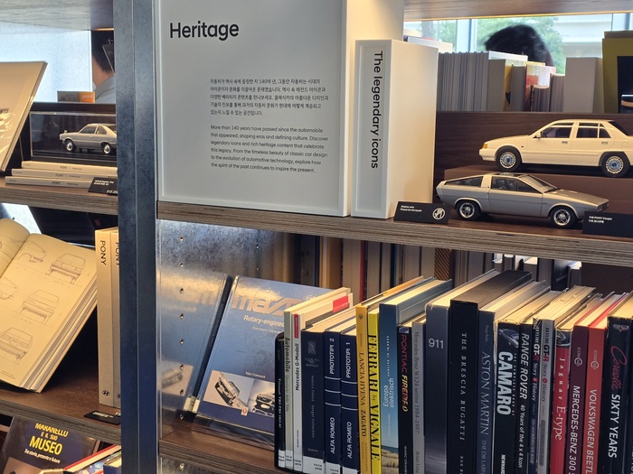 1층에 조성된 ‘오토라이브러리’는 일본 츠타야 서점을 운영하는 CCC와의 협업 결과물이다. 헤리티지, 라이프스타일, 이노베이션 3개 섹션으로 구성되어 자동차의 과거와 현재, 미래를 한눈에 볼 수 있다.