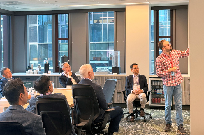 | 박지원 두산그룹 부회장과 경영진이 현지시각 22일 미국 시애틀 아마존 본사를 방문해 담당자로부터 AI 기반 혁신사례와 기술에 대해 듣고 있다./사진: 두산 제공 |