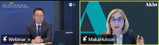 | (왼쪽부터) 김용상 율촌 외국변호사와 마카 허슨(Maka Hutson) 아킨 검프 스트라우스 하우어 앤 펠드(Akin Gump Strauss Hauer and Feld LLP) 변호사가 대담을 나누는 모습 / 세미나 갈무리 |
