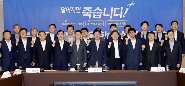 23일 서울 중구 로얄호텔에서 열린 ‘추락사고 예방을 위한 건설사 최고경영자(CEO) 간담회’에서 김영훈 고용노둥부 장관과 건설사 대표들이 건설현장 안전사고 예방을 다짐하며 화이팅을 외치고 있다. 이날 간담회는 주요 20대 건설사 최고경영자(CEO)들이 참석했다.
