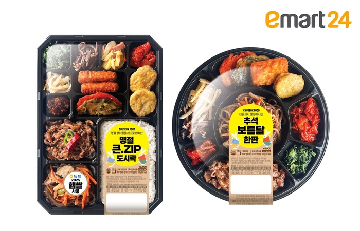 이마트24가 추석 명절 대표음식으로 구성한 도시락 2종을 출시한다. ‘추석명절큰.Zip’도시락은 잡채ㆍ불고기를 메인으로 12가지 반찬을 담았고, ‘추석보름달한판’은 밥 없이 명절 반찬만 구성했다. 큰.Zip 도시락은 명절 큰집 상차림을 도시락에 압축한다는 의미를 담은 네이밍이 특징이다. 보름달한판은 집에서 밥과 함께 먹을 수 있도록 반찬만으로 구성해 차별화했다.