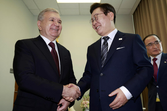 이재명 대통령과 샤브카트 미르지요예프 우즈베키스탄 대통령이 23일(현지시간) 미국 뉴욕 유엔본부에서 정상회담에 앞서 악수하고 있다. / 사진: 연합뉴스 |
