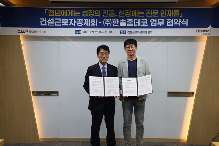 건설근로자공제회는 25일 ㈜한솔홈데코와 ‘마루 직종 청년 건설 기능인 양성 및 취업 지원’을 위한 업무협약(MOU)을 체결했다고 밝혔다.