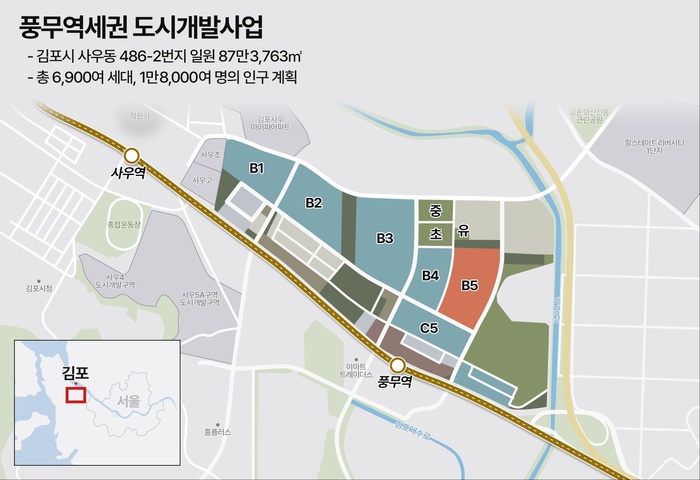 풍무역세권 도시개발사업은 김포시 사우동 486-2번지 일원 87만3763㎡에 총 6900여 가구, 인구 1만8000명을 수용하는 미니신도시 규모로 조성된다. 주거뿐 아니라 상업·교육·업무·행정 기능이 복합된 생활권으로 계획됐다.