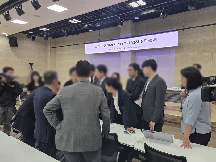26일 세종테크노파크 대회의실에서 개최된 콜마비앤에이치 임시 주주총회에서 관계자들이 총회를 준비하고 있다./사진=오진주 기자 |