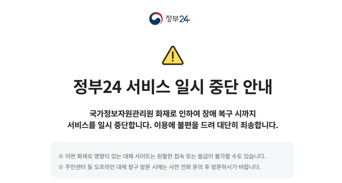 현재 정부24ㆍ국민신문고ㆍ행정심판시스템ㆍ청렴포털 등 국민이 많이 이용하는 행정서비스와 정부 부처 홈페이지 접속이 잇따라 중단됐다. 행안부는 네이버 공지를 통해 대면 민원처리 전 서비스 가능 여부를 전화로 확인해 달라고 안내하고, 전자가족관계등록시스템ㆍ교통민원24ㆍ홈텍스ㆍ국민건강보험 등 대체 이용처를 공지했다.